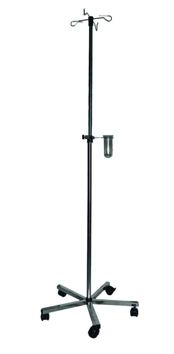 Infusní stojan z nerezové oceli, výškově nastavitelné 120 – 213 cm. Stojan je na kolečkách se 2 brzdami a je až pro 4 infusní lahve a odkapávajícím sklem.