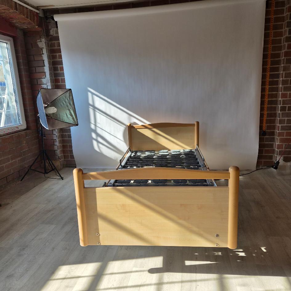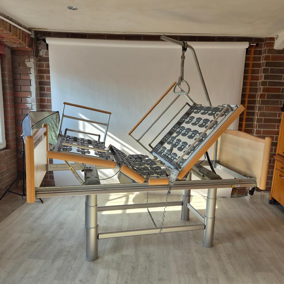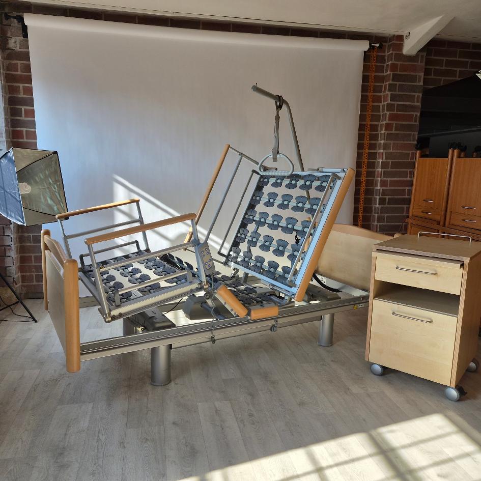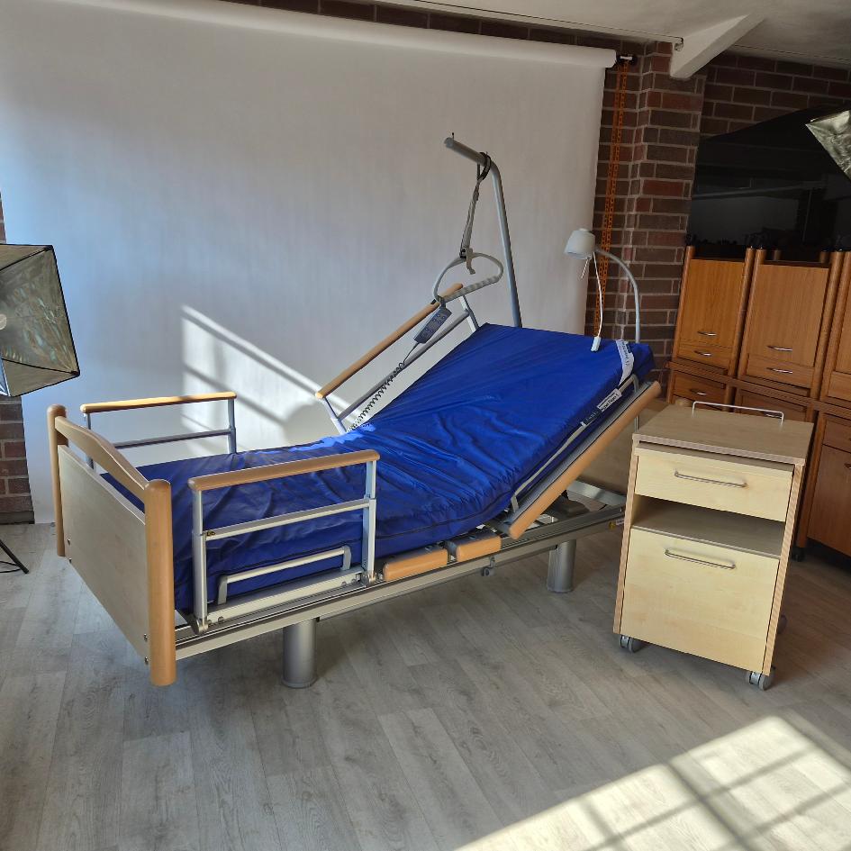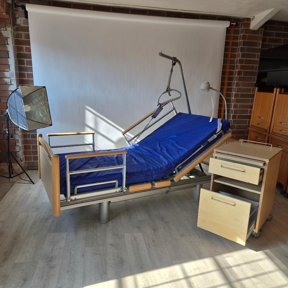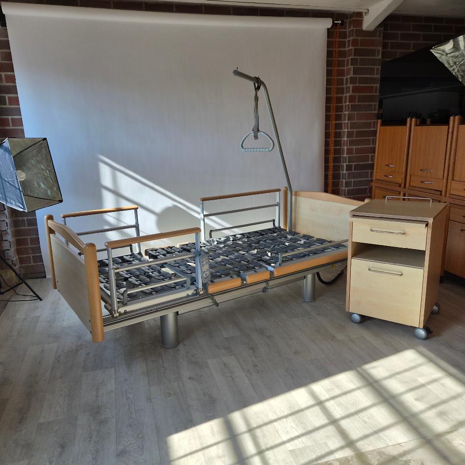 Elektricky polohovatelná repasovaná postel od německého výrobce Völker model 3080 ve světlém odstínu ve zvýhodněném  pečovatelském setu: